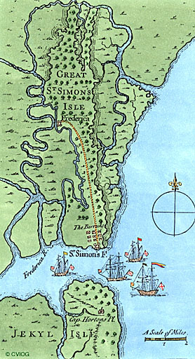 General Oglethorpe established a fort on the northern part of the island in 1738 and a smaller fort on the southern tip where the lighthouse was later built adjoining Military Road. The Colonial Records of Georgia by Candler describes this road as being due east and crossing Gully Hole Creek at its narrowest point. A personal visit to this area suggests that this may have been the entrance through a stockade fence leading inside the town. Also, there are several cement graves rising above the ground. Although the inscriptions are no longer discernible, the fact is (according to Candler) there were deaths occurring as early as 1741. After crossing Gully Hole Creek and the marsh, the road swung to the southeast, crossing the present (Frederica) Road to the south end just north of Obligation Pond which touched the eastern shore of St. Simons. From this point, it followed the edge of the marsh to the site of the Battle of Bloody Marsh.