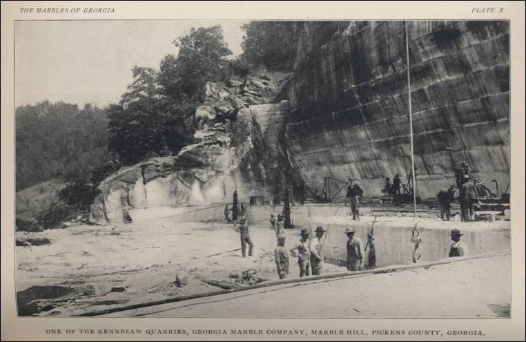 Marble is a metamorphosed limestone prized for its hardness and variety and is quarried in north Georgia near Tate, in Pickens County. This marble has been used extensively for gravestones and in buildings throughout the United States, including the U.S. Capitol. Sixty percent of the monuments in Washington, D.C., are Georgia marble. Actually, the use of marble dates back to ca 1400, when it was used to carve effigies, bowls, projectile points, and other necessities. These early artifacts were found in Pickens County and are now part of the permanent exhibit at the Etowah Mounds near Cartersville. Colonel Samuel Tate, a grandson of Colonel Samuel Tate had foreseen the possibilities of marble being mined in Pickens County. For that reason, he secured large tracts of the precious marble-stocked land. Also, in 1834 he purchased many lots from the original drawers in the land lottery just four years before the departure of the Indians from the area. Everyone did not take up their land from the 1832 lottery of North Georgia. Ultimately, Colonel Tate became president of the Georgia Marble Company of Pickens County. Ref: The Constitution, Atlanta 12/13/1886.