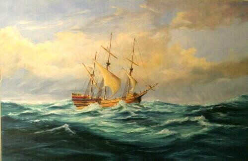 On June 7, 1609, a fleet of seven ships and two pinnaces left Plymouth, England, with immigrants bound for Jamestown, Virginia. After only a few days out, one of the pinnaces returned to England. The Sea Venture carried Sir Thomas Gates, Lieutenant Governor; Sir George Somers, Admiral of the fleet; and Captain Christopher Newport, Vice Admiral. These three men were leaders of the expedition, and to avoid any dispute as to precedence, they agreed to sail on the same vessel. The idea turned out to be an unwise decision! On July 28, a violent storm, the tail of a West Indies hurricane, separated the Sea Venture from the rest of the fleet. In 1610, William Strachery, a passenger on the ship, wrote about this storm. It was later said that his description influenced Shakespeare’s writing of “The Tempest.”